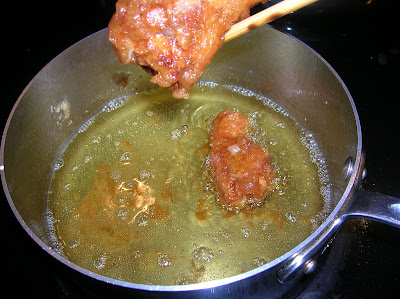 Heat 3 cups of vegetable oil in a pot on high. When oil is very hot, dip the wings in the batter and drop into oil. Put a batch of 3 wings together and lower temp to medium. Do not put another more wings until this batch is done.