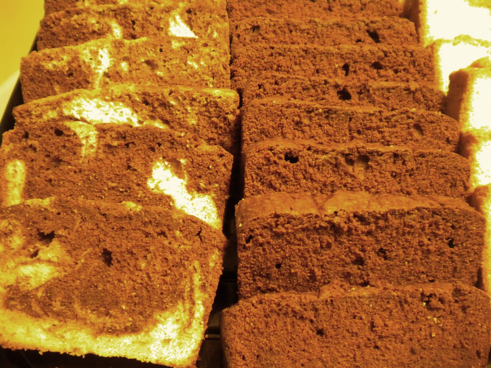 In two greased pan, lined with parchment paper, pour mixture and bake a 325 deg F for 1 hour 20 mins.
