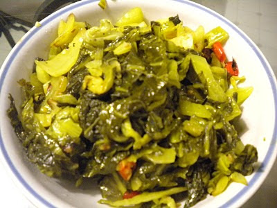 Drain greens; rinse and drain again. Cut out and sicard core from greens then coarsely chip leaves (yield about 3 1/2 cups)