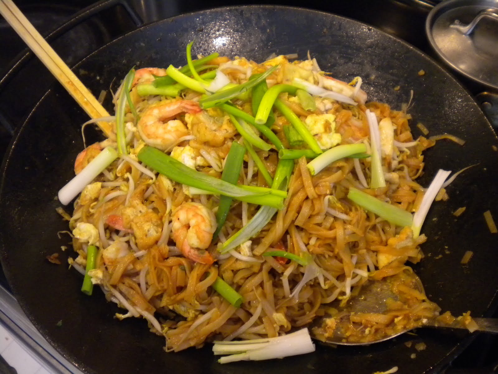 Push the noodles to the side of wok and in the middle of wok, add a tbs of peanut oil to fry the beaten egg. When egg is done about 1 min, bring the noodles to fry together. Add the bean sprouts and scallions. Fry for a min but do not overcook the bean sprouts.
