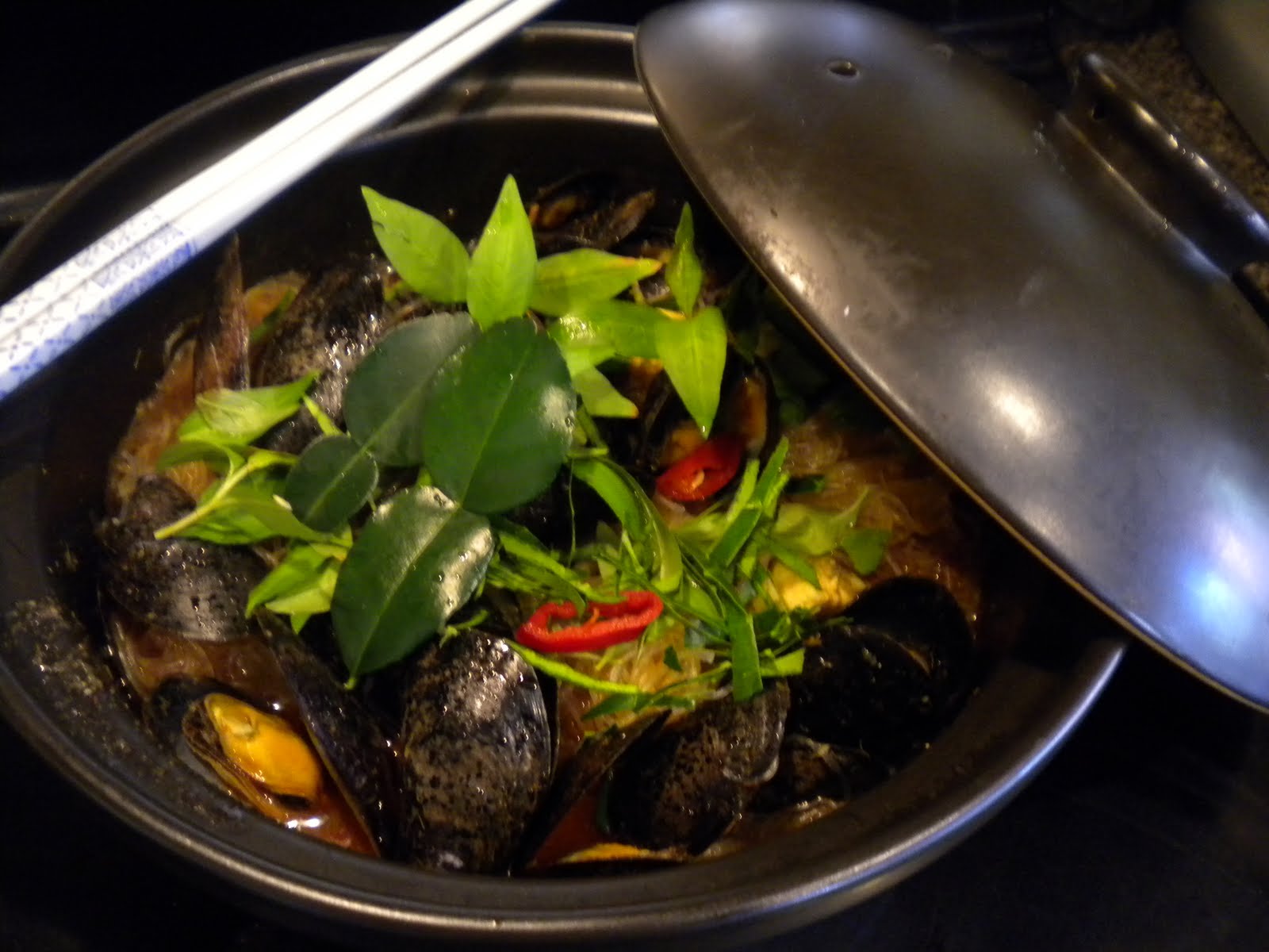 Add mussels and glass noodle. Taste to make sure it is salty and spicy enough, otherwise add another tbs of tom yum paste until u feel its good enough. When mussels opened, dish is done. Remove Vietnamese coriander and discard. Garnish with lime leaves and serve immediately !!