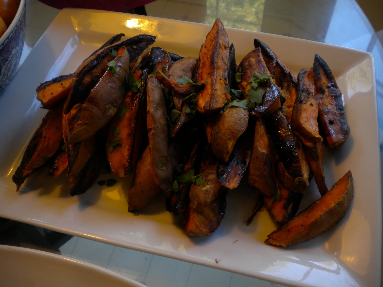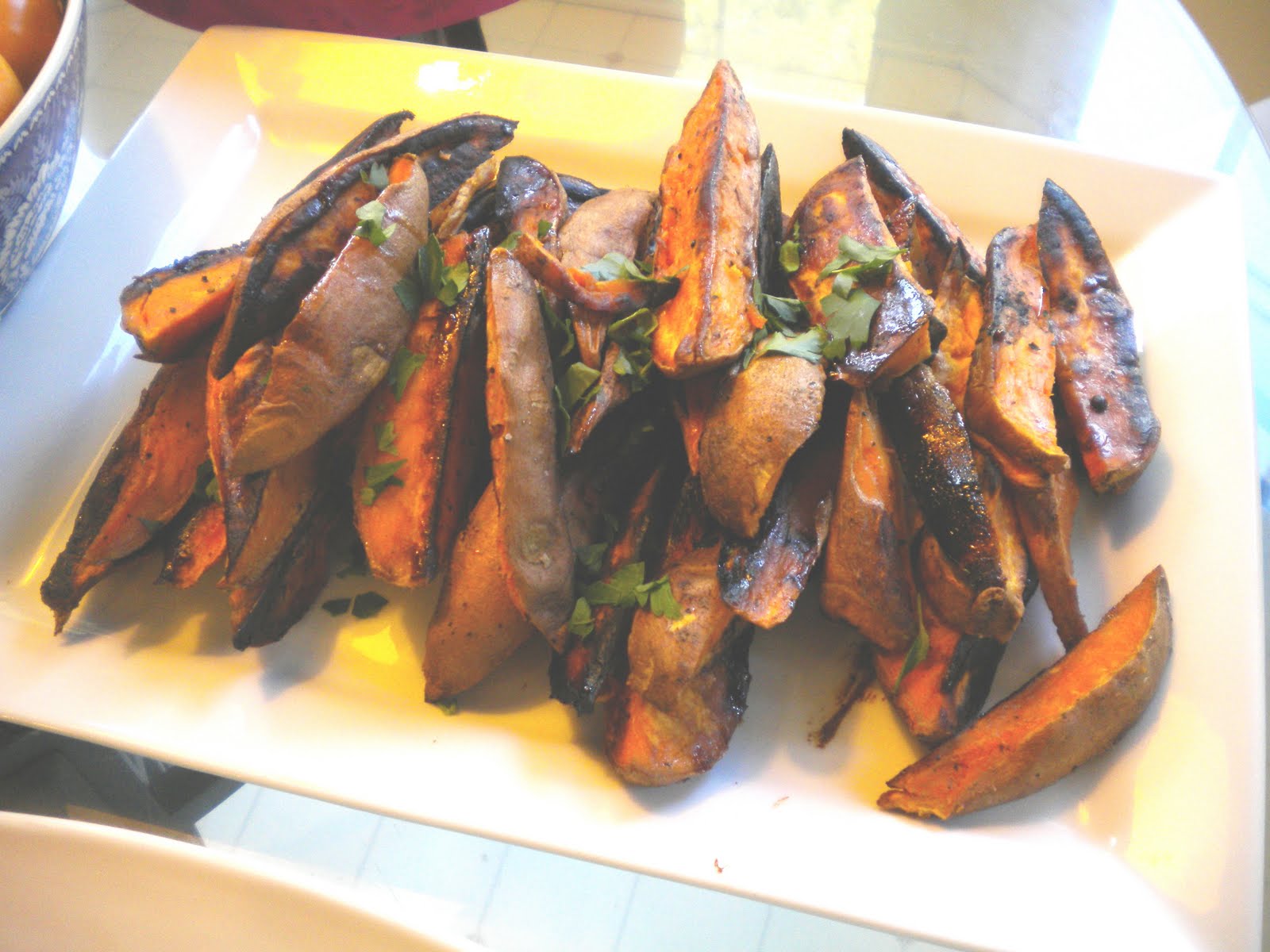 Cut sweet potatoes lengthwise into spears - half potatoes, and then 3-4 spears each side.
