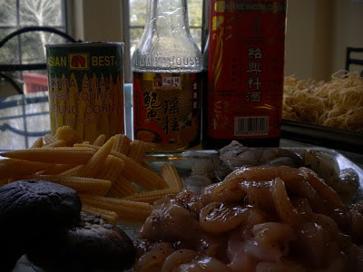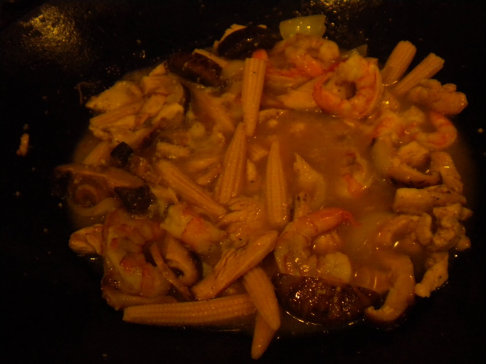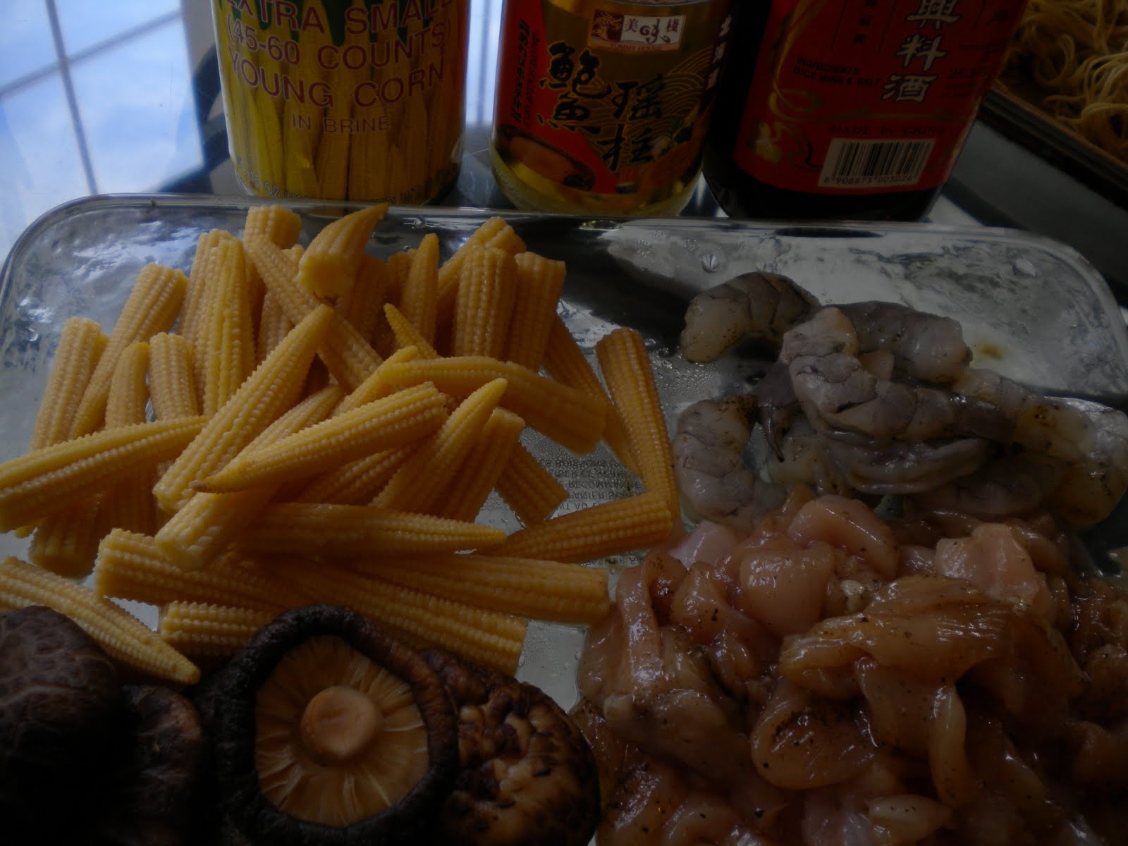 Baby corn from the can, prawns shelled and deveined, strips of chicken breast (marinate in a tbs of soya sauce), and shitake mushroom (or you can substitute with button mushrooms).