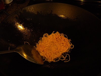 Heat wok until very hot, add cooking oil for deep frying. When oil is very hot, add in the noodles in batches until light brown and crispy.