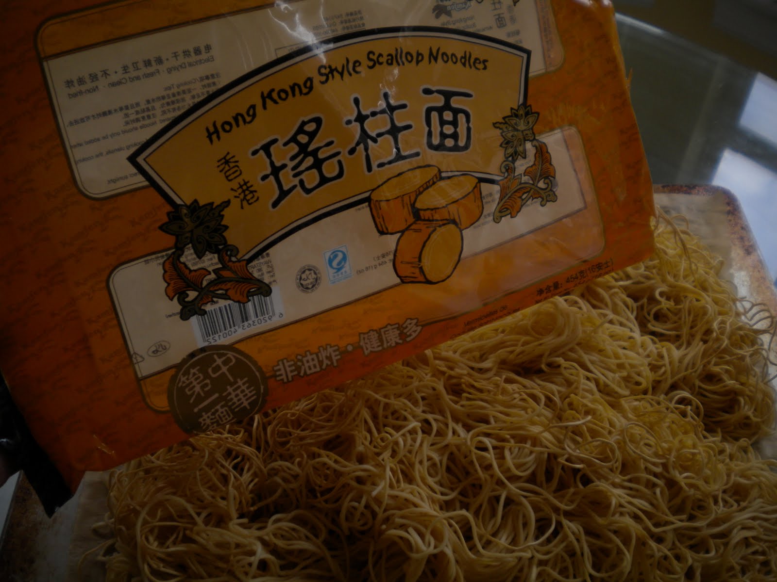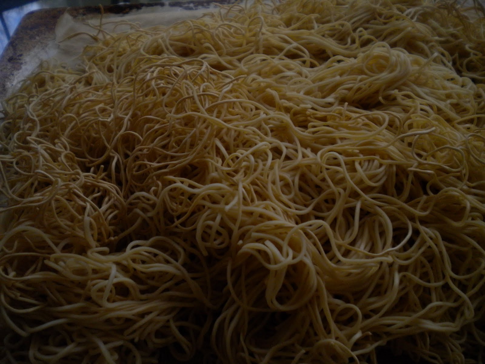 Crispy noodle, boiled in hot water and drained and strained to remove the water. Lay it down on a sheet pan and dry it out in the oven for 15 mins at 350 deg F. (midway, turn the noodles over to dry out the rest of the noodles).