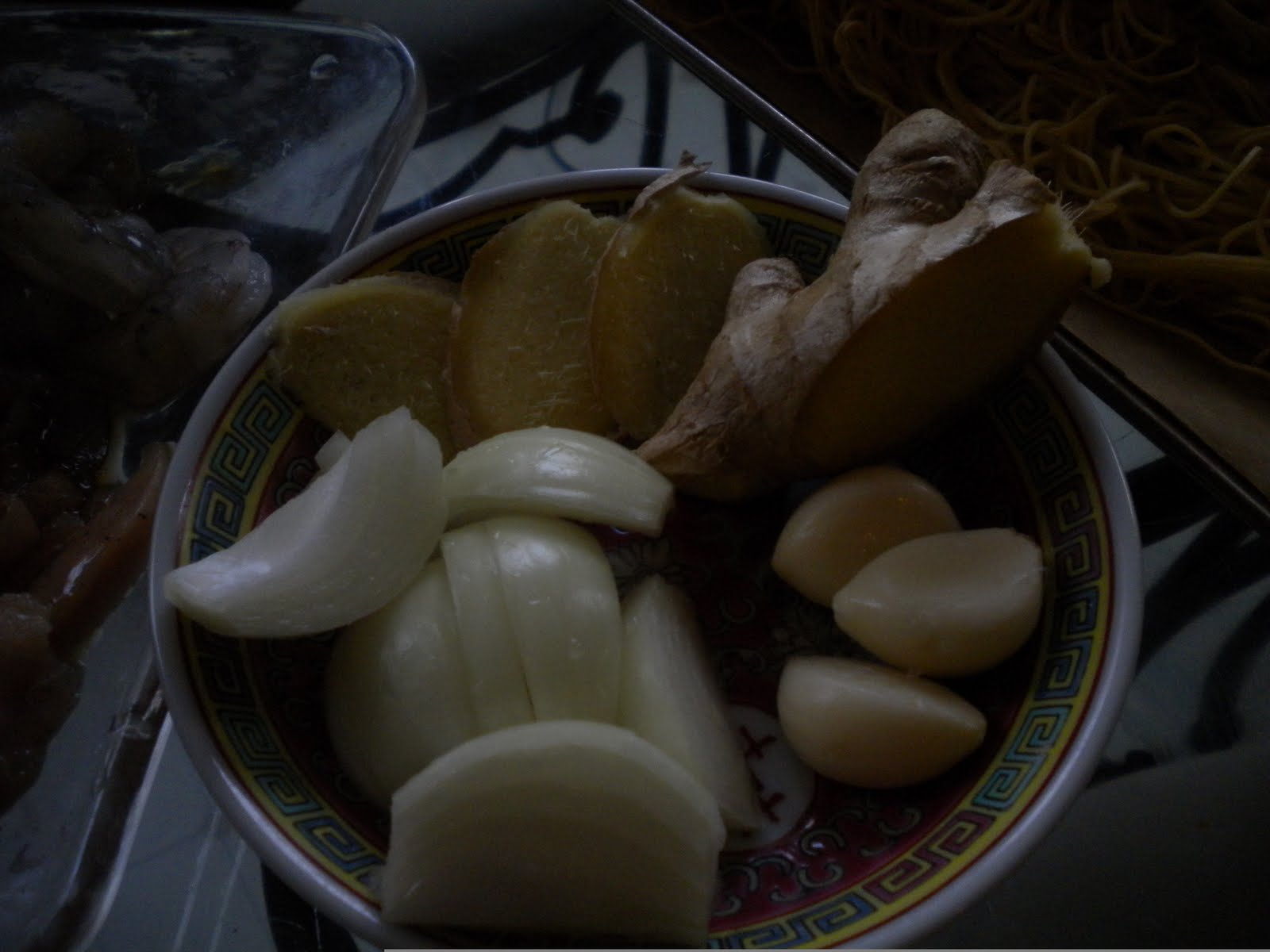 a couple of slices of ginger, 3 cloves of garlic and a small onion cut up.