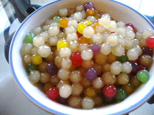 I bought the sago balls which comes in a package from the vietnamese/chinese grocery store. They are used for the popular Bubble Tea. They come in packages of white, black or multi color. If you do not have these, then try making the triangles using the recipe below.
