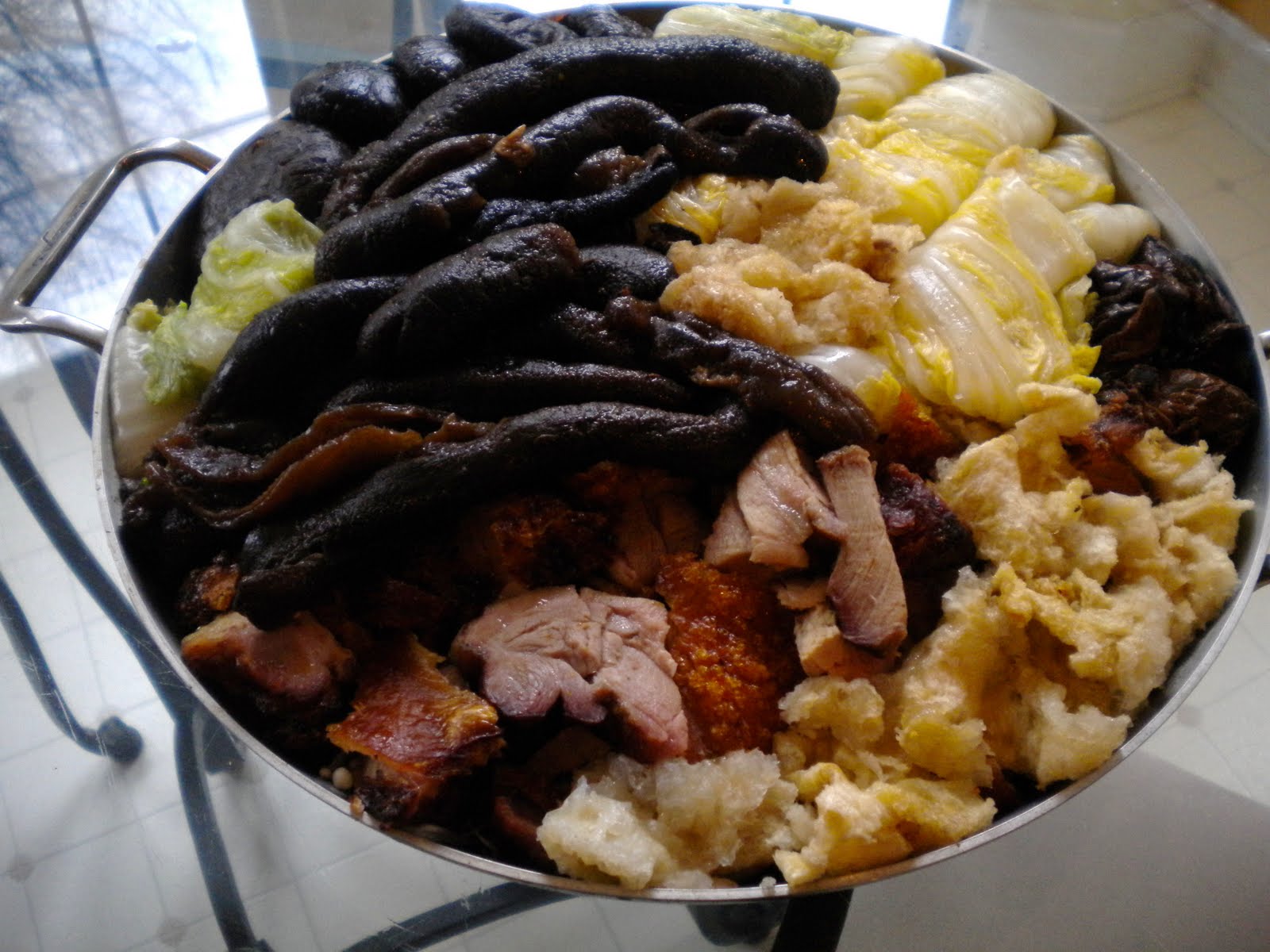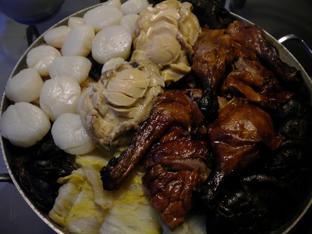 Slide the yam/potatoes about 1 inch thick and lay flat on the basin. Then start layering all the vegetables and meat. The shitake, sea cucumber, dried oyster will need to be cooked before adding to the basin. Blanched the nappa and roll it up and add to the basin. Arrange the food so that they are tight in the basin. The scallops and abalone will be the last to go in so that they are not overcooked. Add a little bit of water, oyster sauce and simmer the pot over low heat for 1 hour or so until all are cooked well. Serve hot !