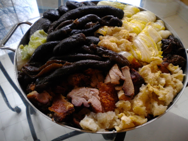 The dish is a pot of various meats, braised dried seafood and stewed vegetables all stacked in layers. Pen cai, the hanyu pinyin name translates to "basin of food", is also called poon choy in Cantonese, and has been a popular dish in China for ages. But the dish supposedly came about in China when the Song emperor was fleeing from Mongol invaders and arrived at a village in the Guangdong area. To serve him and his army, the local folk collected the best food from each household. There wasn't a bowl big enough to hold the food, so they put everything into basins, and pen cai was created.
