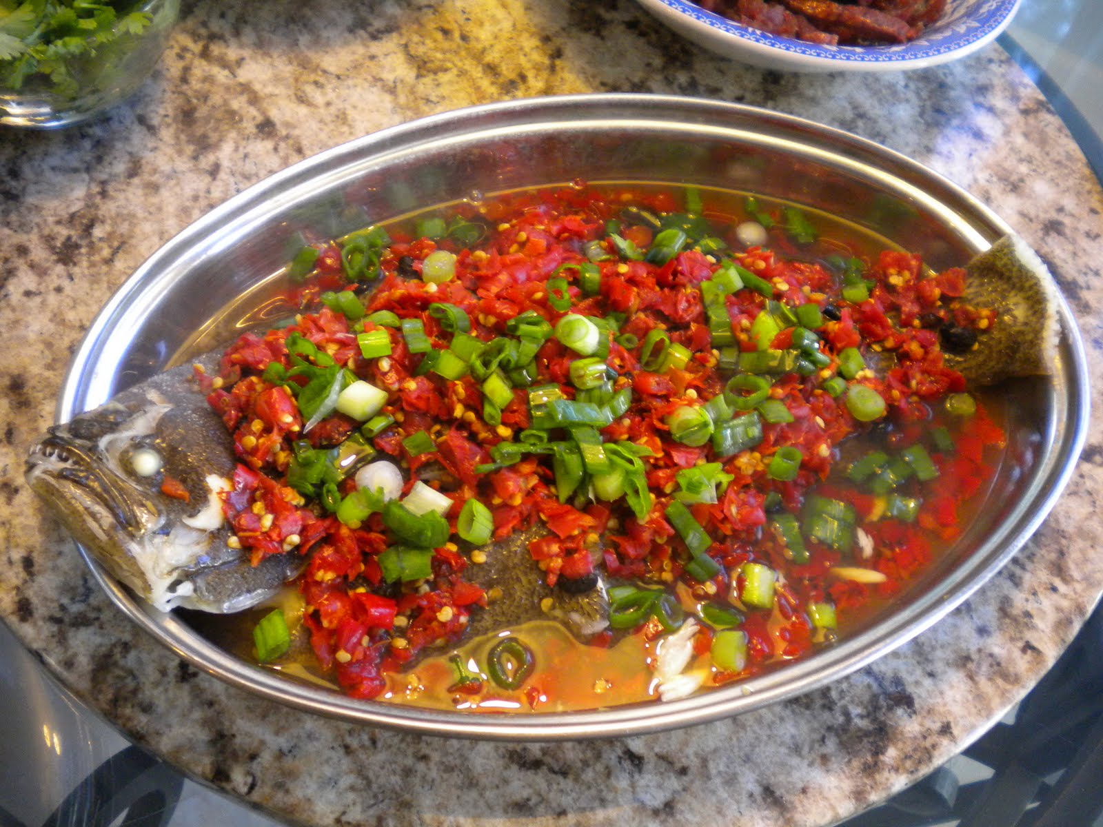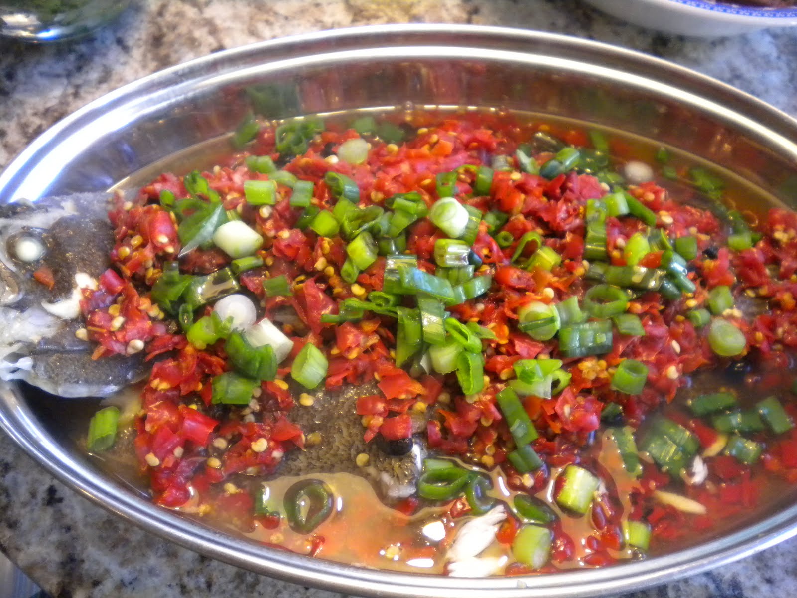 Add chicken stock and cooking wine. Season with pepper, then spoon pickled red chili and black beans evenly over fish. Steam for 10 mins or until fish is cooked.