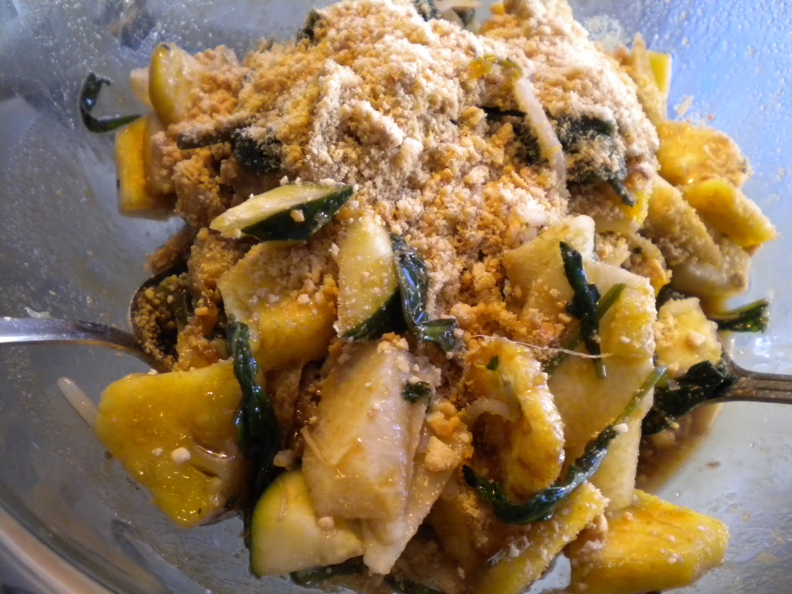 Add 1/2 peanuts to the dressing. Add the vegetables and combine.