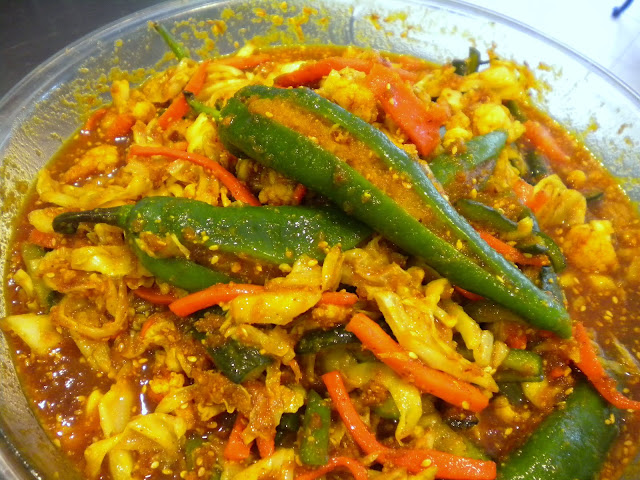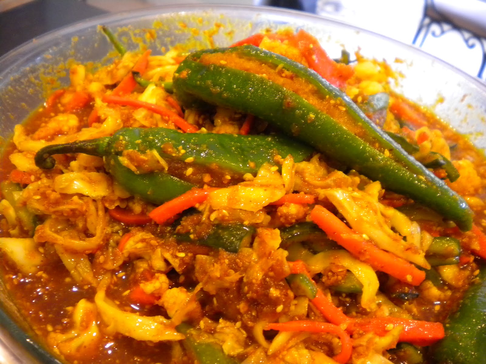 Every Chinese New Year, my sister Elsie’s mother-in-law in Singapore would make her Acar in large quantities and my sister Elsie would bring home a few jars for us. They were so good and out of this world! I got my sister Elsie to share her recipe with me. It is a very tedious preparation but it’s worth the trouble to taste this amazing, mouth watering additive pickles. This year, I decided to make for my Malaysian friends and they liked it. So hope you liked it too.