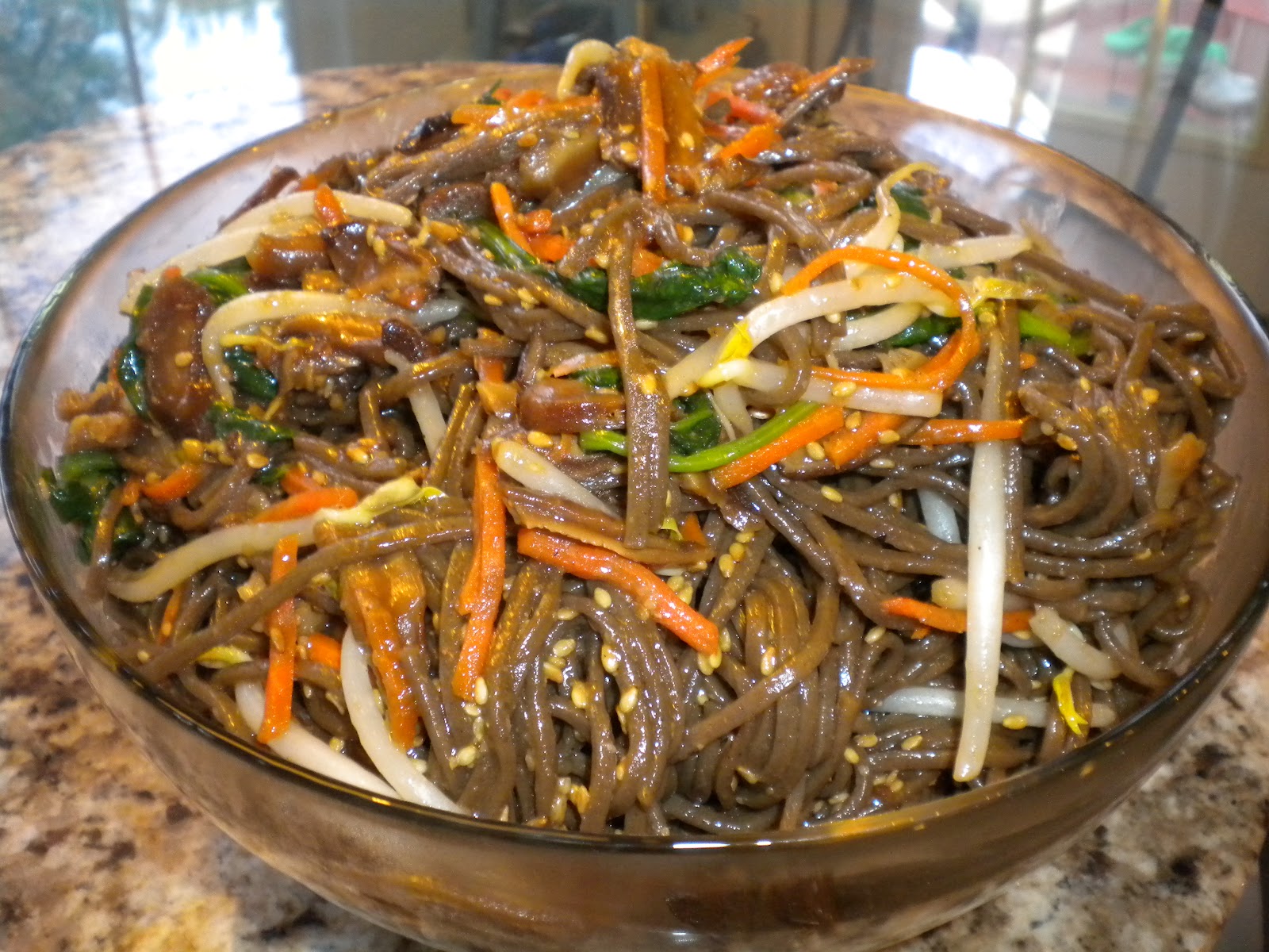 Boil and drain buckwheat noodles according to directions. Add the spinach, carrots and bean sprouts. It will get cooked along with the heat from the noodles. Add the rest of the ingredients and taste. add more sugar/soya sauce according to taste. Good even at room temperature !