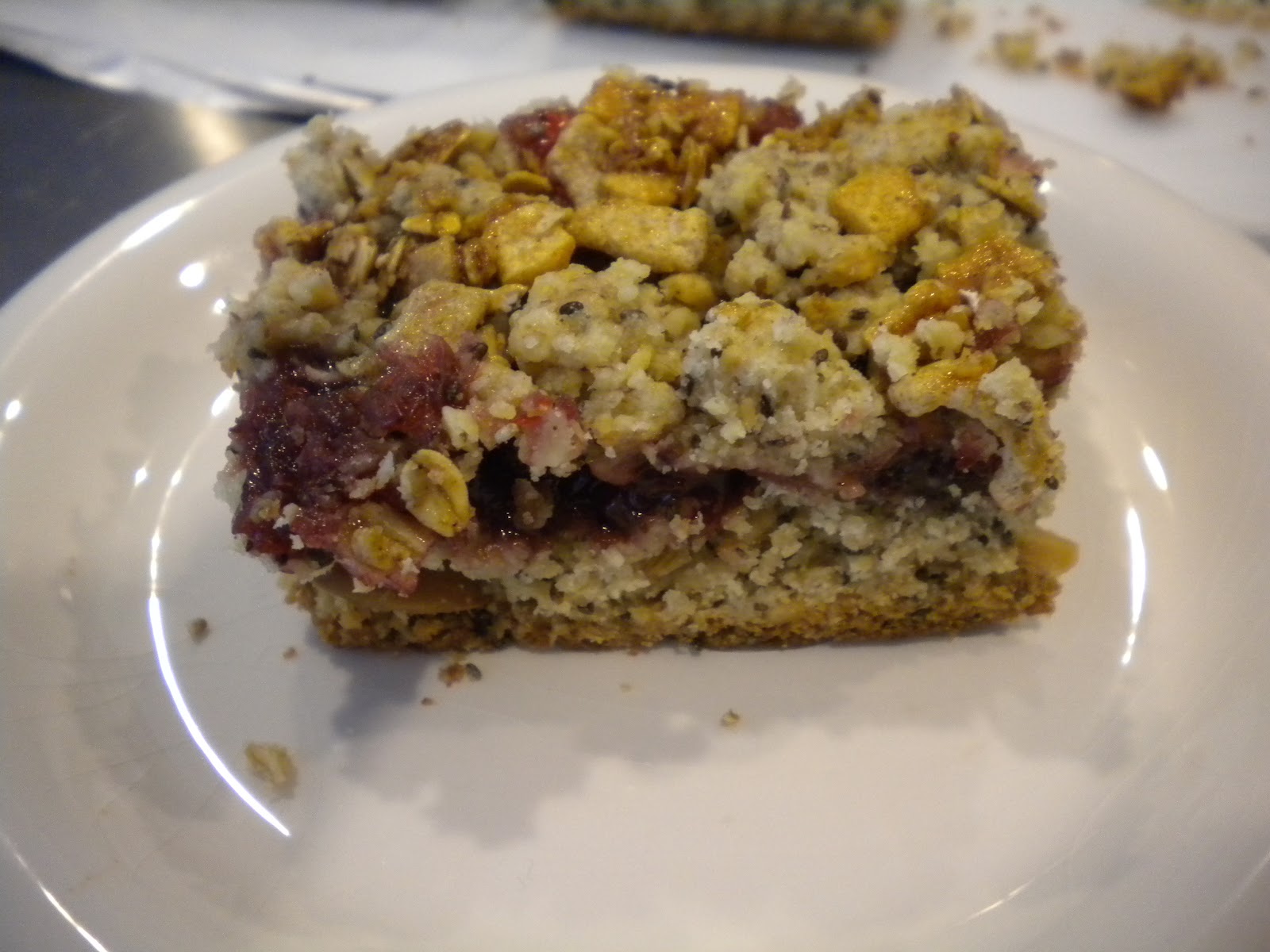 Bake for 30 to 40 mins or until light golden brown throughout. Remove the pan from the oven, spoon the granola jam on top and spread in an even layer with the spoon or with a spatula covering the surface. Remove the reserved granola mixture from the refrigerator and break it up with yoru fingers into a small bowl. Add the Chiaseeds, flaxseeds, sunflower seeds and millet and stir to combine. Sprinkle the mixture like a crumb topping evenly over the jam.