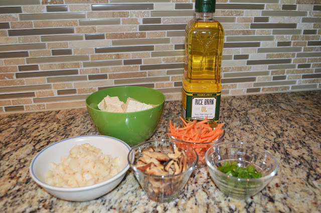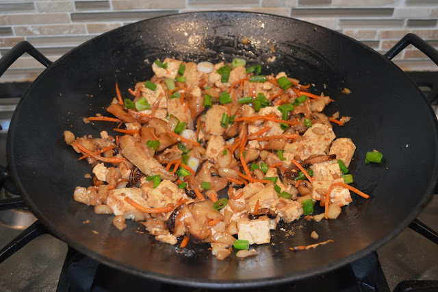 Heat rice ban oil on wok in high heat. Stir fry each of the ingredients one after the other layering each for 1-2 mins: mushroom, carrots, waterchestnuts, tofu. Then add all the seasonings: oyster sauce, soya sauce, shaoshing wine, sugar. Taste. Add white pepper and sesame oil last. Remove and let rest on a plate.