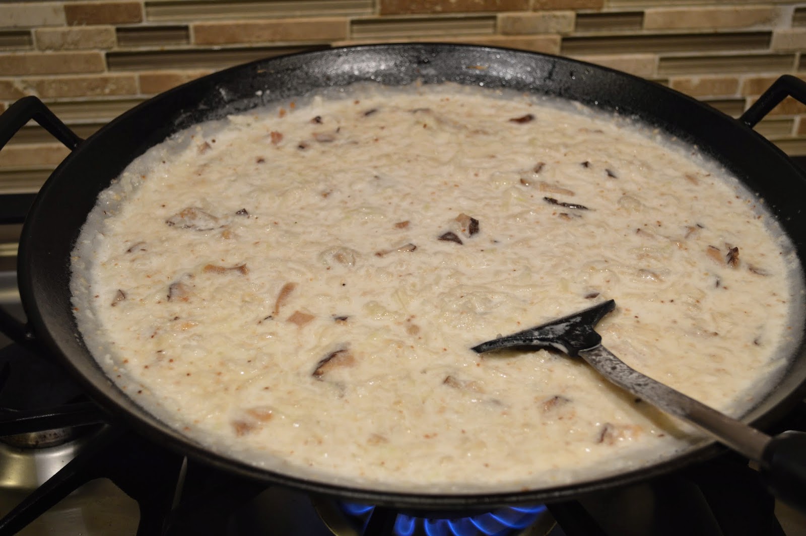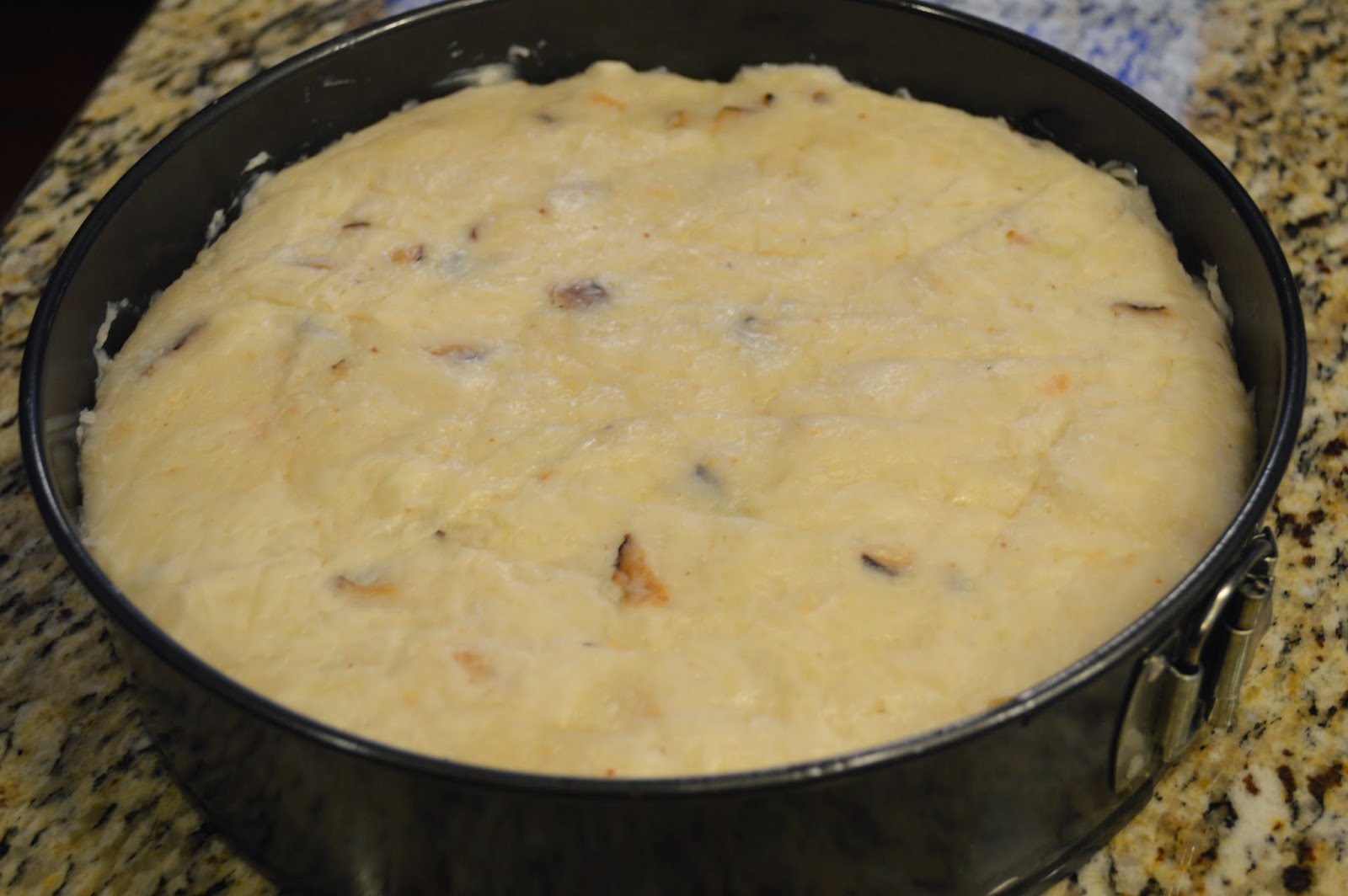 Turn to medium heat, add the rice water, and cook in wok until it becomes a dough. Taste and add salt and pepper as needed. Remove from wok and press into cake pan.