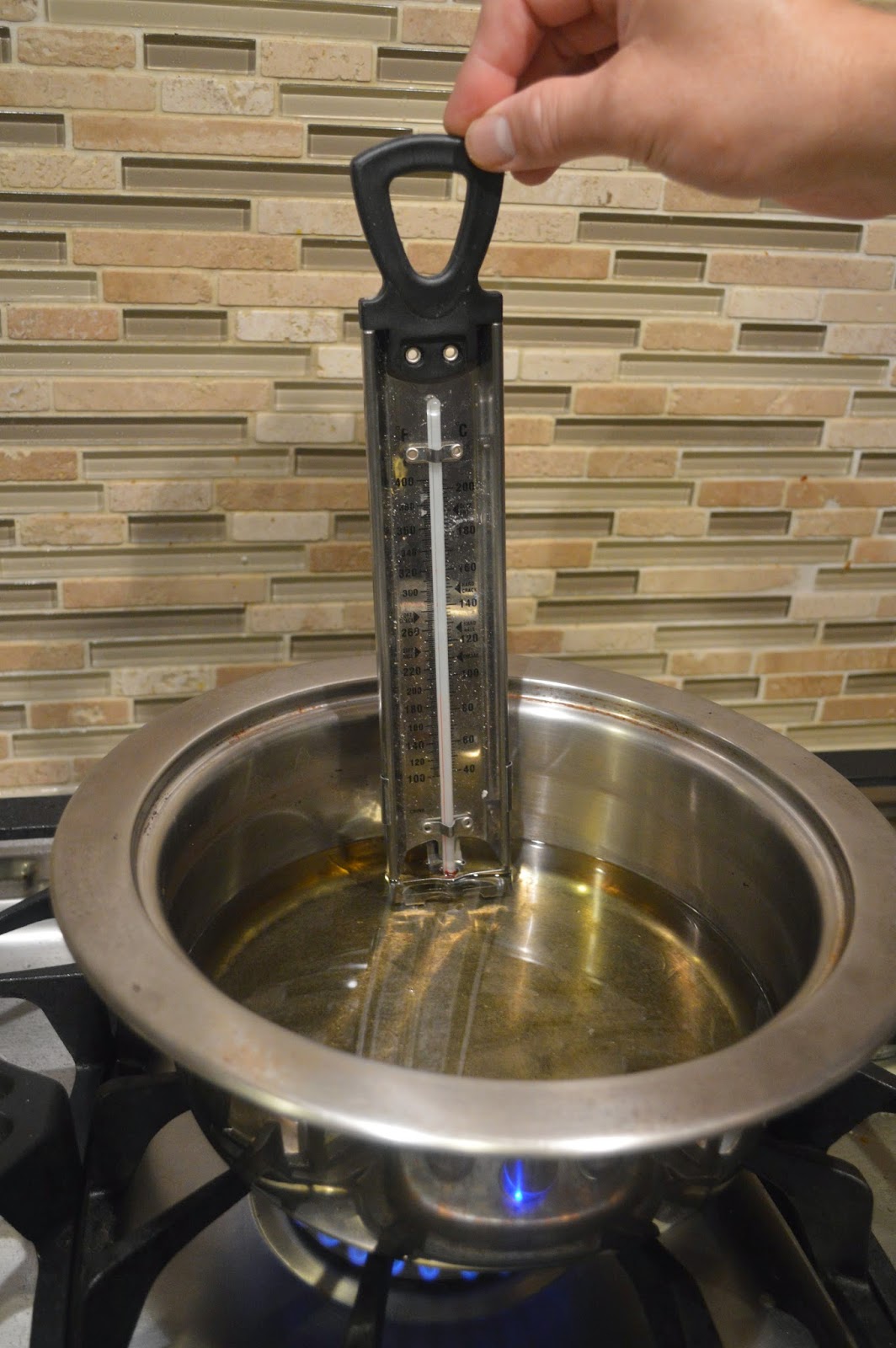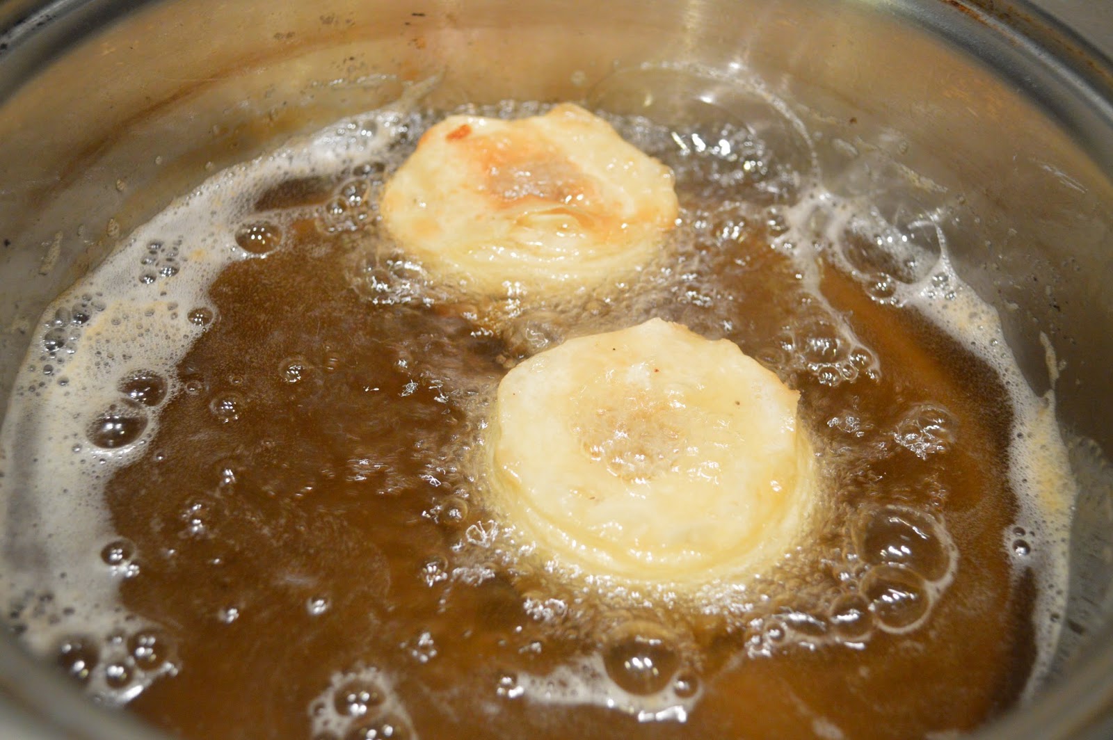 1. Heat grapeseed oil in a large pot until it reaches 350 deg F (175 deg C). Use a deep frying thermometer to verify that the oil is at the right temperature. Line a platter with several layers of paper towels for draining the pastries.