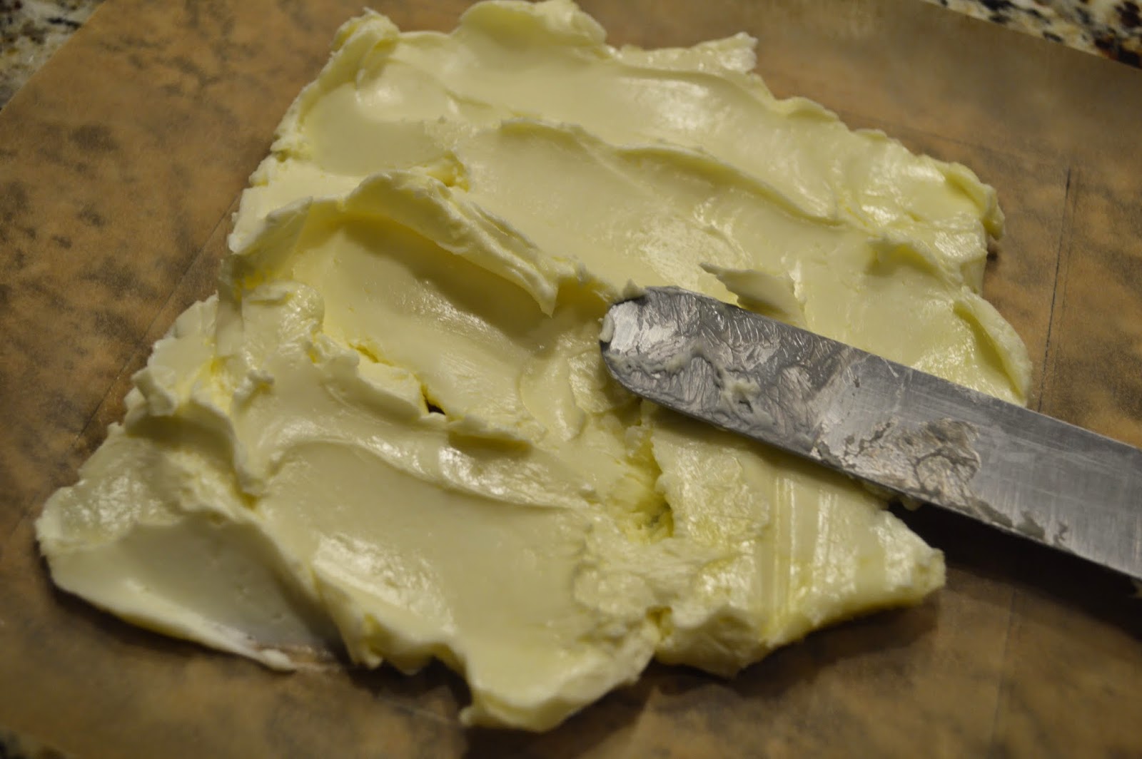 Draw a 7-inch (18cm) square on a piece of parchment paper with a pencil. Flip the parchment over so that the butter won't come in contact with the pencil marks. Place the butter in the center of the square and spread it evenly with on offset spatula to fill the square. Refrigerate overnight.
