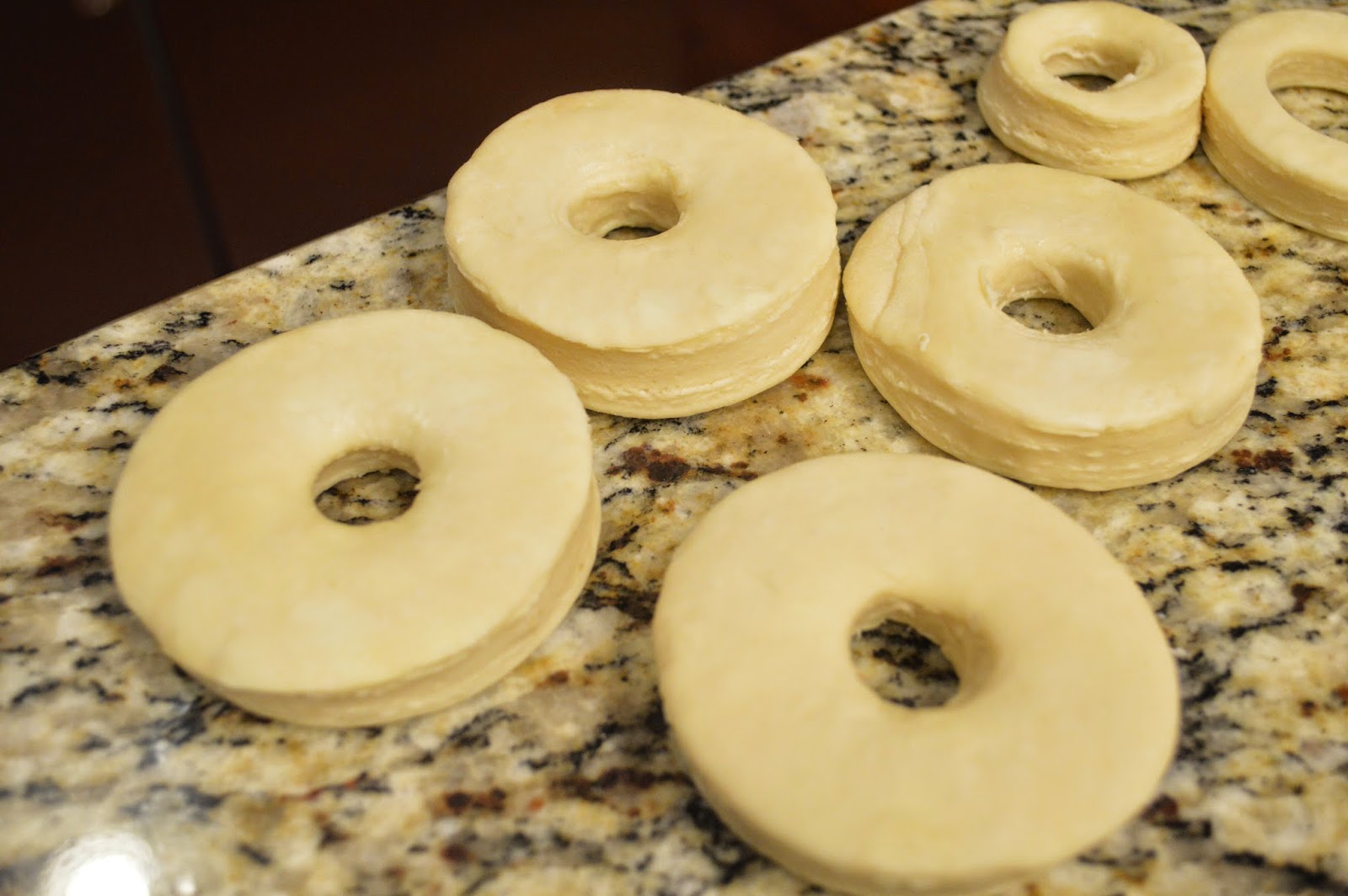 2. Using a 3 1/2 inch (9cm) ring cutter, cut 12 rounds. Cut out the center of each round with a 1 inch (2.5cm) ring cutter, to create the doughnut shape.