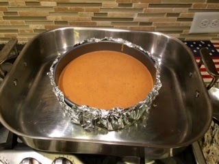Wrap a double layer of aluminum foil around the bottom and sides of the springform pan. Add the filling and smooth the top. Place in the center of a roasting pan. Pour hot water into the roasting pan to reach halfway up the sides of the springform pan. Bake until the cheesecake is firm but jiggles slightly in the center, 45 minutes to 1 hour. Let cool in the water bath before topping with the meringue. The cheesecake can be refrigerated overnight.