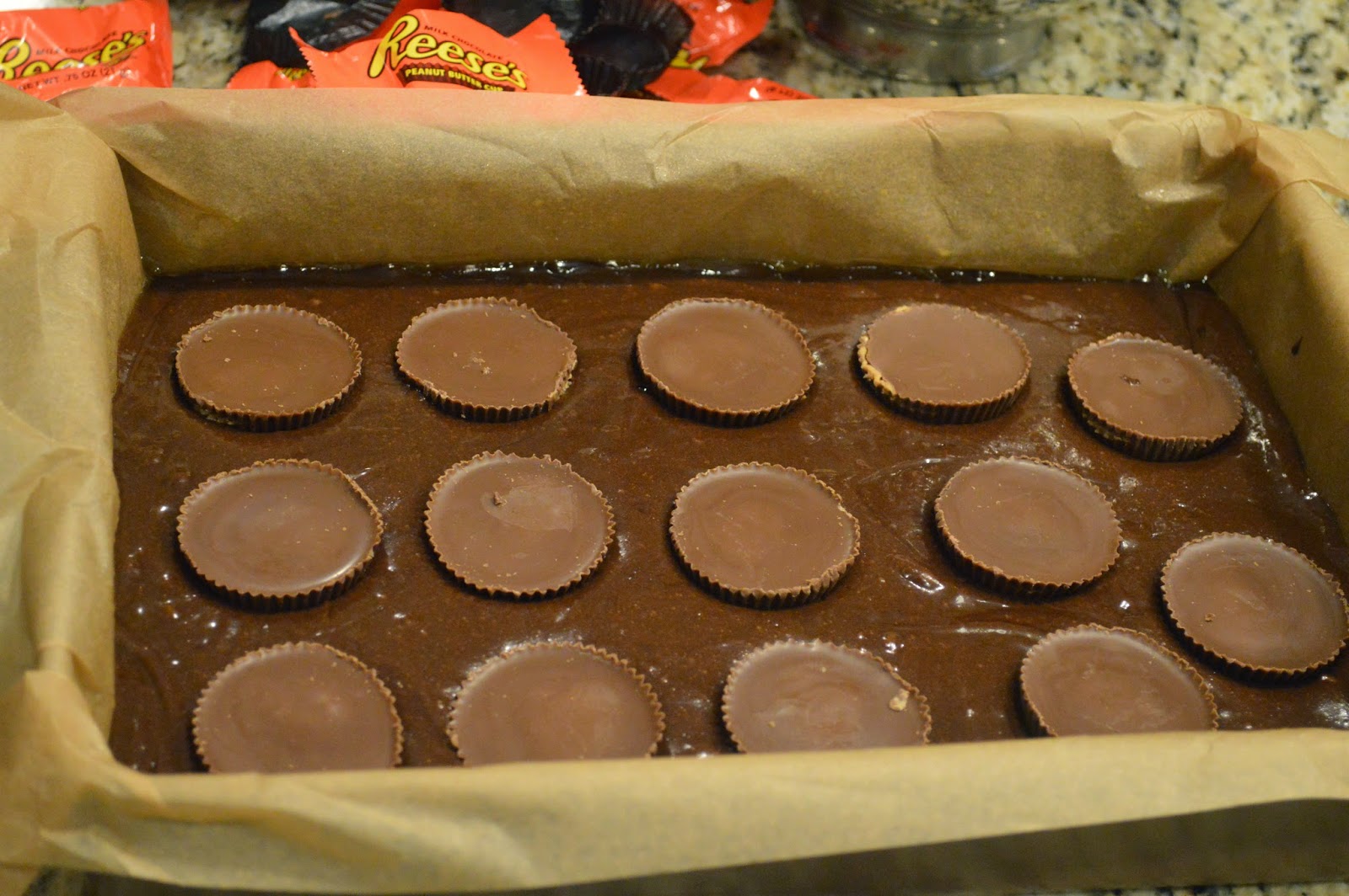- Unwrap 12 (or 11...) large Reeses PB cups and press them into the brownie batter. Swirl the top with a spatula, so that the PB Cups are covered.