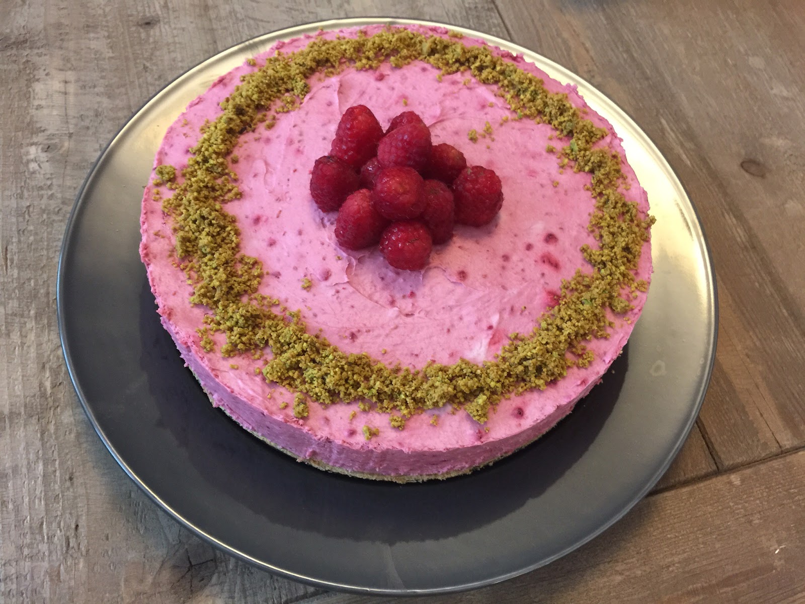 Empty the mixture into the spring form pan and refrigerate overnight. To server, garnish the remaining ground pistachios around the cake and top the middle with raspberries.